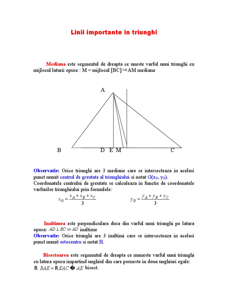 Descoperiți tot ce are scribd de oferit, inclusiv cărți și cărți audio de la editori majori. Acesta (adica, centrul de greutate) se afla la o treime de baza si doua treimi de varf. Triunghiul este figura geometrică dată de reuniunea segmentelor închise determinate de trei puncte distincte necoliniare.