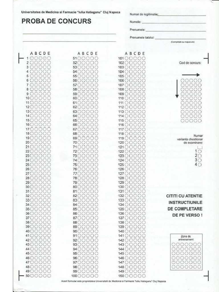 vizitati articolul complet aici : http://grilemedicina.com/subiecte-admitere-umf-cluj-napoca/ Grile admitere 2015 facultatea de medicina si farmacie oradea facultatea de medicina sl farmacie specializarea medicina admitere iulie 2015 gril rspunsuri corecte numr de concurs pdf. Testul grila dat in cadrul concursului de rezidentiat medicina dentara din centrul cluj, anul 2015 a fost alcatuit din 200 de intrebari intercalate. Rezolvă grile online pentru admiterea la medicină!